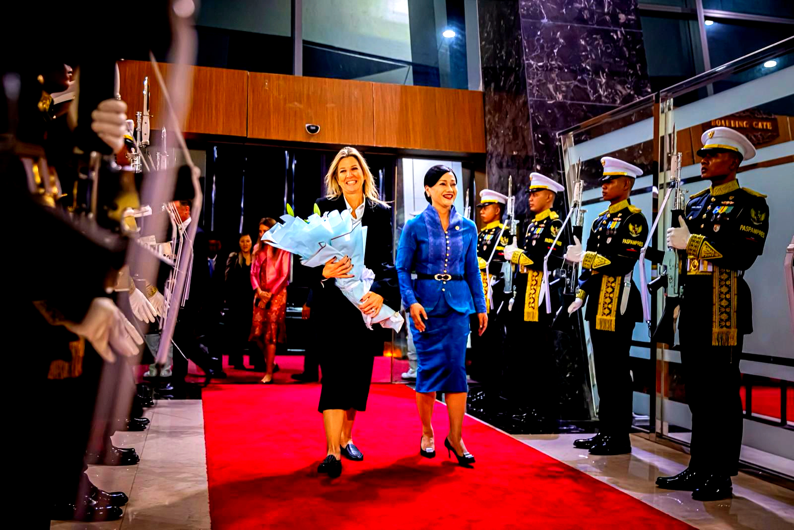 Begitu pintu pesawat terbuka, penyambutan berlangsung hangat. Friderica Widyasari Dewi, anggota Dewan Komisioner OJK untuk Edukasi dan Perlindungan Konsumen, berdiri berdampingan dengan Marc Gerritsen, Duta Besar Kerajaan Belanda untuk Indonesia, Timor-Leste, dan ASEAN, serta Gita Sabharwal, UN Resident Coordinator di Indonesia. Ketiganya menyambut Ratu Máxima yang tiba dengan senyum lebar, suasana yang terekam dalam foto resmi UNSGSA karya Patrick van Katwijk.