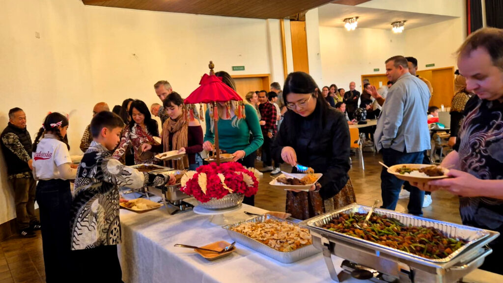 Setelah prosesi wisuda, para peserta menikmati hidangan khas Indonesia, mulai dari rendang, sate ayam, salada padang, tempe orek, sosis solo, hingga martabak manis dan dadar gulung. Lagu-lagu Indonesia kembali dinyanyikan, menambah hangat suasana.